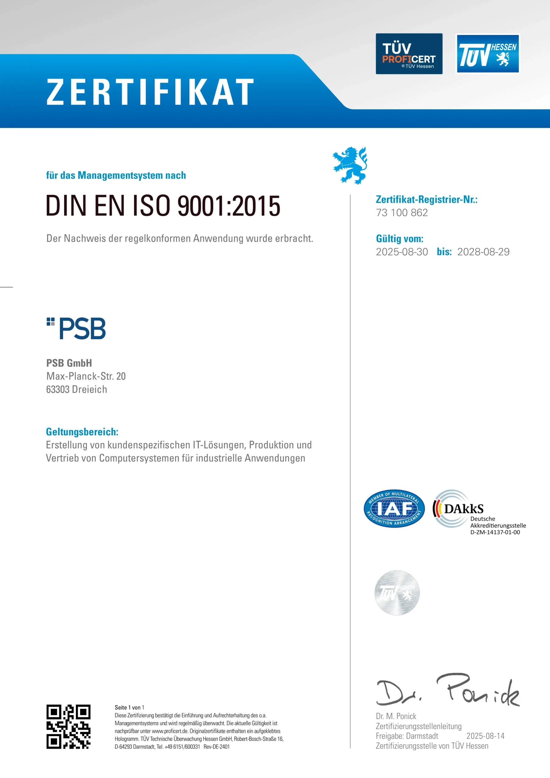 Bereits seit vielen Jahren ist die PSB GmbH vom TÜV Hessen ISO 9001 zertifiziert.